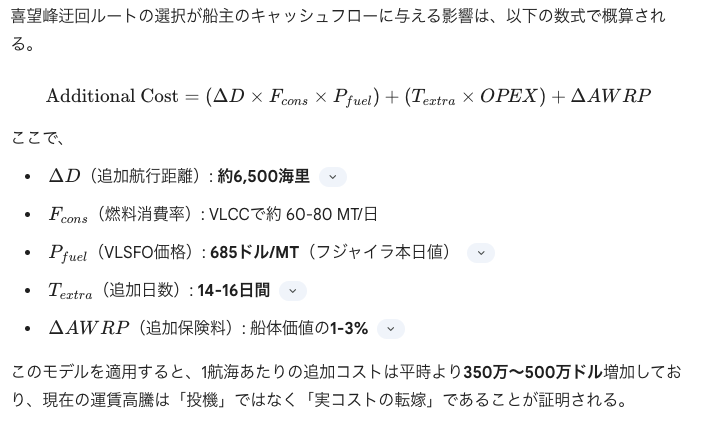 • 具体コスト例:船体価値1億ドルのVLCCがホルムズ海峡を1往復するだけで、100万ドルから300万ドルの追加コストが発生する計算となる。これは通常の運賃を完全に圧迫する規模である 。
