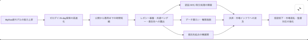 以下のフローは、公開資料から確認できる脅威経路を、日本の金融機関向けに整理し直したものである。AISI、Anthropic、Reuters、NCSC、金融庁資料を総合した分析図である。[33]